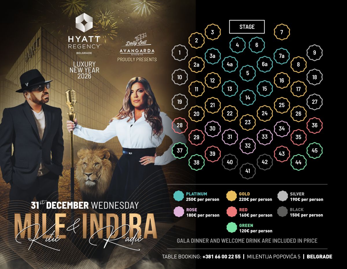 Najluksuzniji doček Nove godine u prestonici! U organizaciji Avangarda Events i hotela Hyatt Regency Belgrade, u najluđoj noći 31. decembra očekuje vas spektakularni nastup Mileta Kitića & Indire Radic – balkanskih legendi i majstora nezaboravnog provoda!