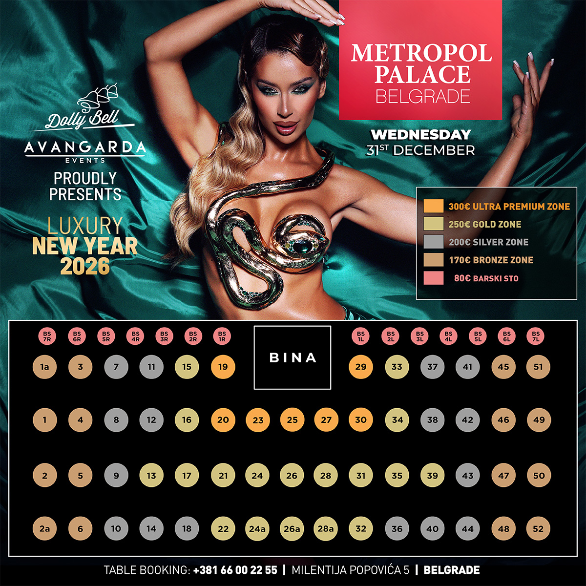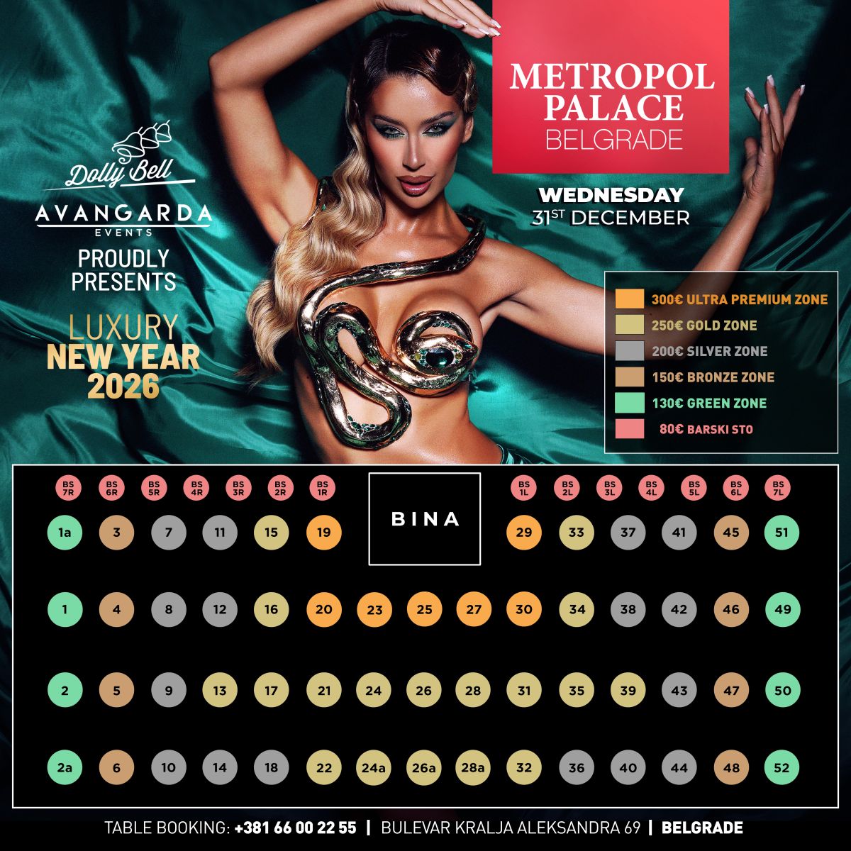 Najluđa noć u gradu stiže u luksuznom izdanju! U dvoranama hotela Metropol Palace očekuje vas glamurozan doček sa spektakularnom produkcijom i nastupom Tee Tairović. Broj stolova je ograničen, a uz svaku ulaznicu obezbeđena je fantastična svečana večera – uračunata u cenu. Odaberite svoju zonu i osigurajte savršenu poziciju u sali.