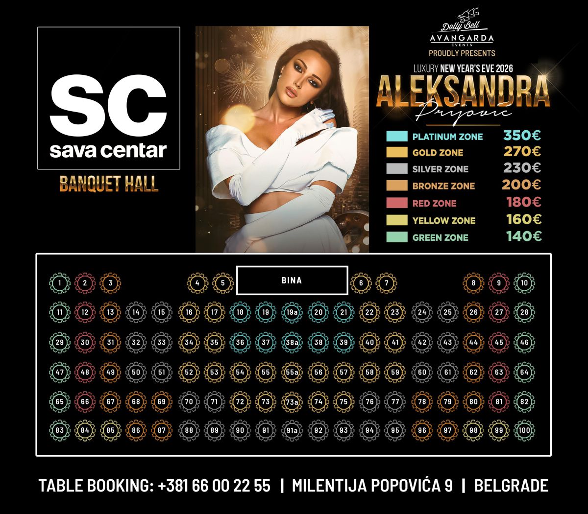 U najsvečanijoj sali obnovljenog Sava Centra dočekujemo 2026. godinu uz vrhunski koncert Aleksandre Prijović! Očekuje vas veliki novogodišnji spektakl sa premium ozvučenjem, scenskim efektima i glamuroznom atmosferom.
